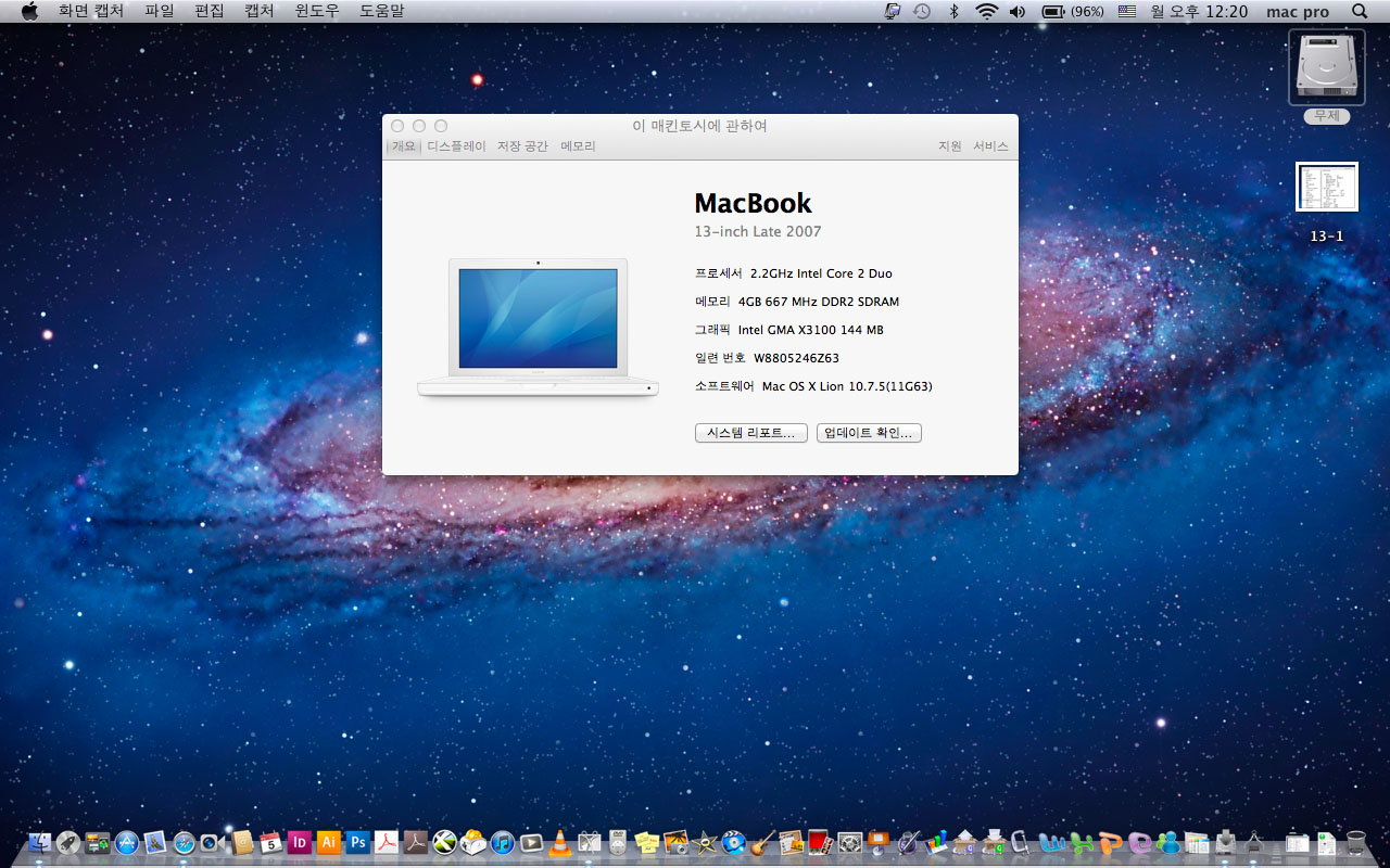 [판매완료] 맥북 13인치- 맥 디자인프로그램들과 윈도우7 설치됨
