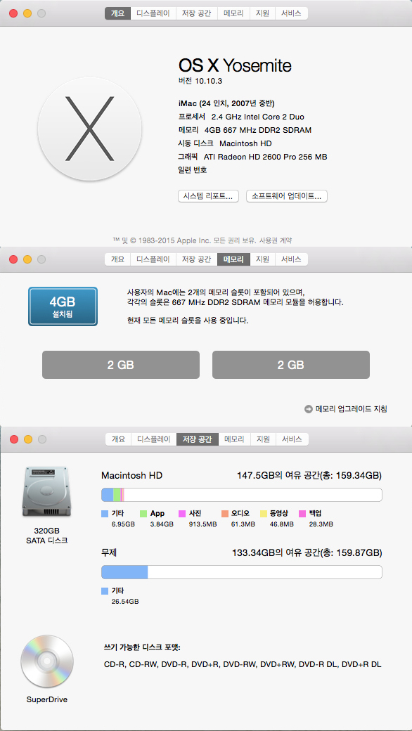 요세미티10.10 /윈도우7 설치되어있어 멀티부팅으로 맥,윈도우 다쓰실수있습니다.