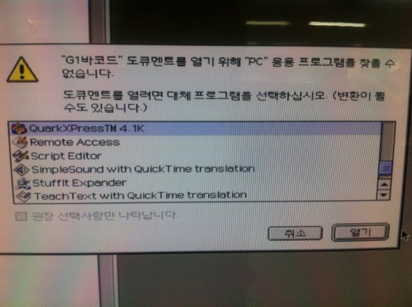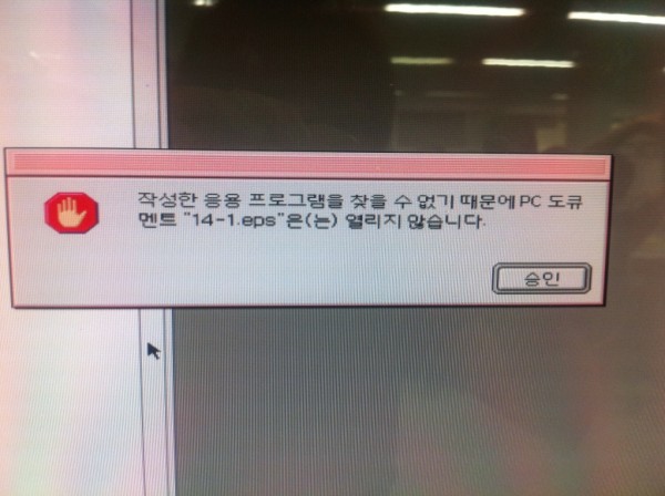 통화하신 내용처럼 압축을 안해서 나오는 문제 입니다.<BR><BR>일러스트 파일은 프로그램에 직접 드래그 해보거나 열기에서 오픈을 해봐도 마찬가지라면 resedit로 이용해서 정상파일에 일러스트와 똑같은 형식으로 맞쳐보세요.<BR><BR><A href="http://www.tomatomac.com/bbs/board.php?bo_table=06_program&amp;wr_id=1633&amp;sca=&amp;sfl=wr_subject&amp;stx=resed&amp;sop=and">http://www.tomatomac.com/bbs/board.php?bo_table=06_program&amp;wr_id=1633&amp;sca=&amp;sfl=wr_subject&amp;stx=resed&amp;sop=and</A><BR>=============================================================<BR>맥A/S,맥구입 또는 인텔맥에 윈도우XP 설치가 필요하시면 위에 (베스트맥-A/S,판매)아이디를 클릭하고 자기소개를 참고해 주세요. <BR>