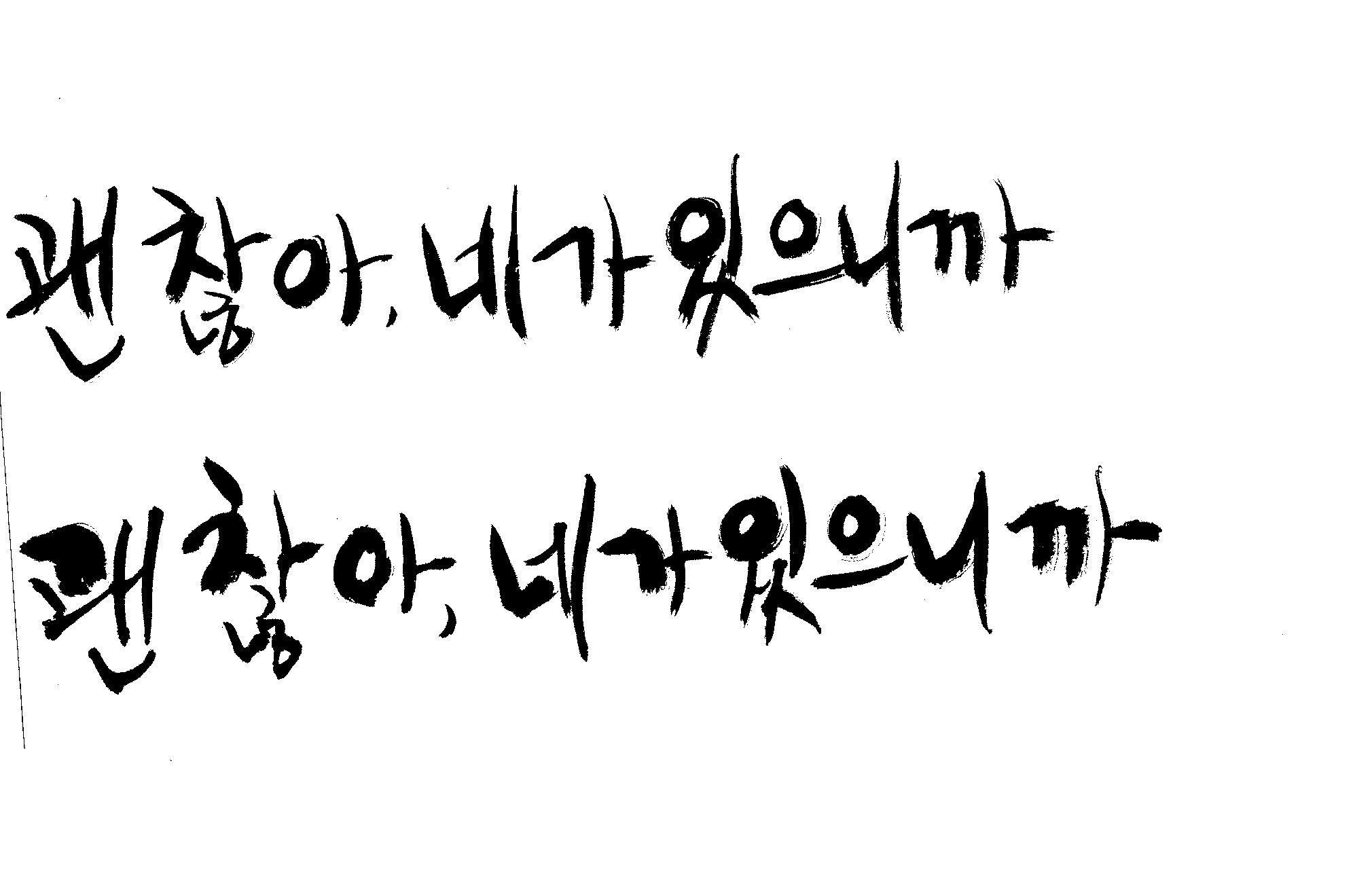 캘리 하나 부탁드릴께요. 김철호 일반 0 7389 2009.01.06 22:48 > > > > > 지금 작업중인 표지가있는데 > > > > 손글씨로 한번 작업해보려구요 > > > > 부탁드립니다. > > > > 괜 찮아, 네가 있으니까 > > >