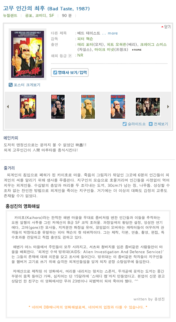 몇년전에 보고 며칠전에 유연히 또 보게 되었는데요.  피터잭슨의 데뷔작이라고 해서 봤드랬죠. B급 호러물로 데뷔한 지금은 유명해진 감독들이 몇있어요. 아마 호러물이 다른 장르보다 여려 다양(?)한 시도를 해볼수 있어서 인것 같아요.