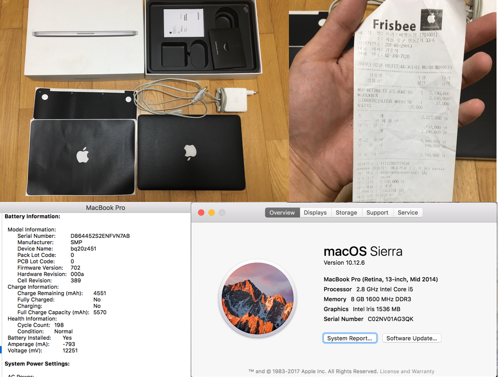 스팩은 512gb, 2.8 Ghz i5, 배터리는 198 사이클이고 7-8시간 사용 가능합니다.