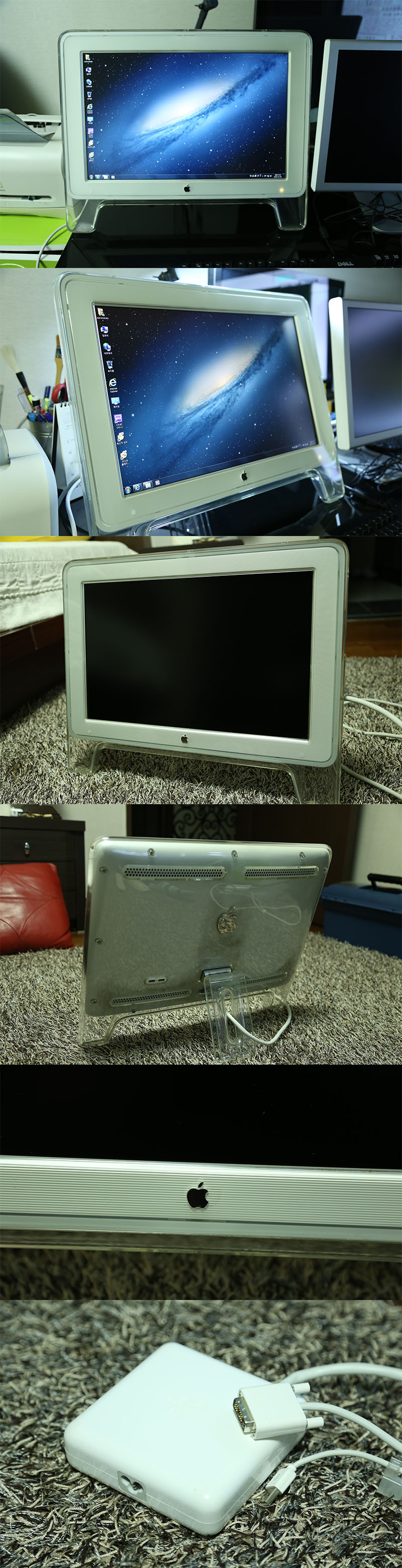 전체적인 상태는 좋구요, 후면에 약간의 그을림(?) 은 있습니다. 받침대 짱짱하구요. adc어댑터도 같이 포함입니다. 일반 DVI단자에서 사용케끔 해주는 고마운 녀석이죠^^