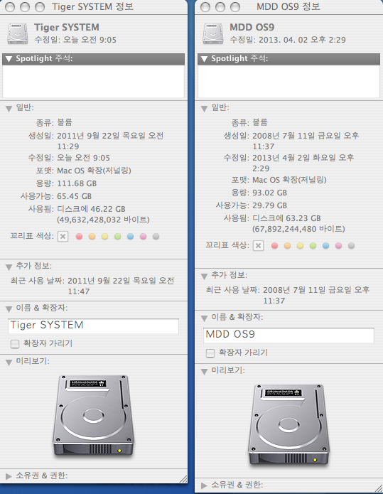 Mac OS X 10.4.11 과 9.22 개별하드에 별도로 부팅 가능합니다.