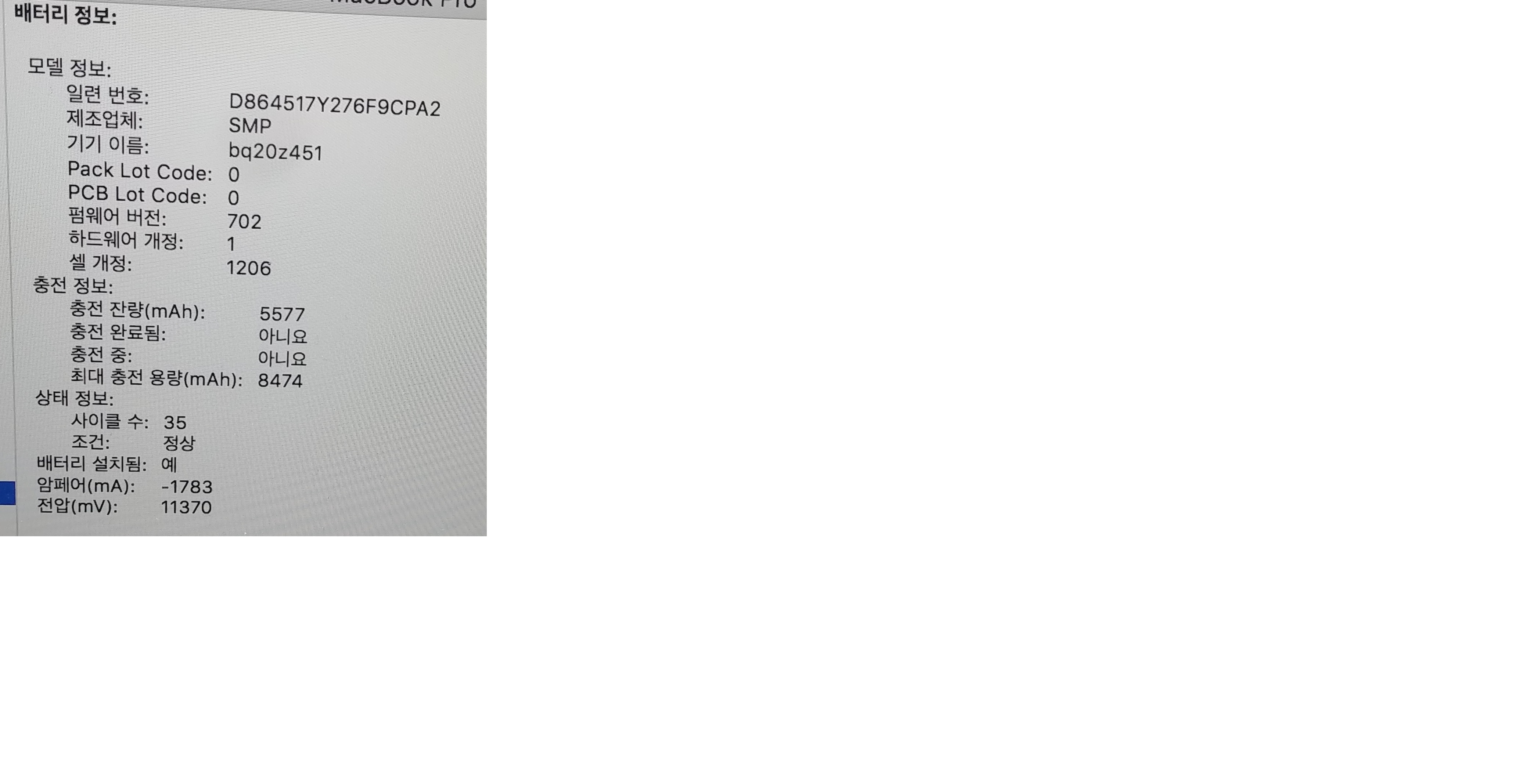 배터리 사이클 35  최대충전용량 8474