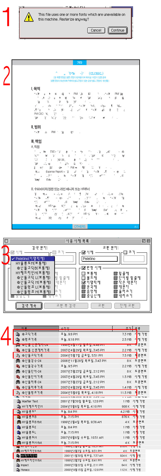 1. 그림과 같이 문구가 나옵니다. 뭐 대략 이시스템에는 없는 서체가 있다. 그래도 열겠나?