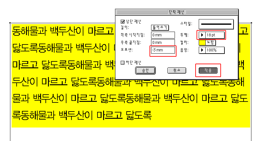 네.~ 괘선두께를 36 이런식으로 넓게 주면 가능한거 같네요. 그런다음 기준선이동<커맨드+옵션+시프트+(+ or -)>으로 살짝 조정해주면서 하시면 될거같습니다.