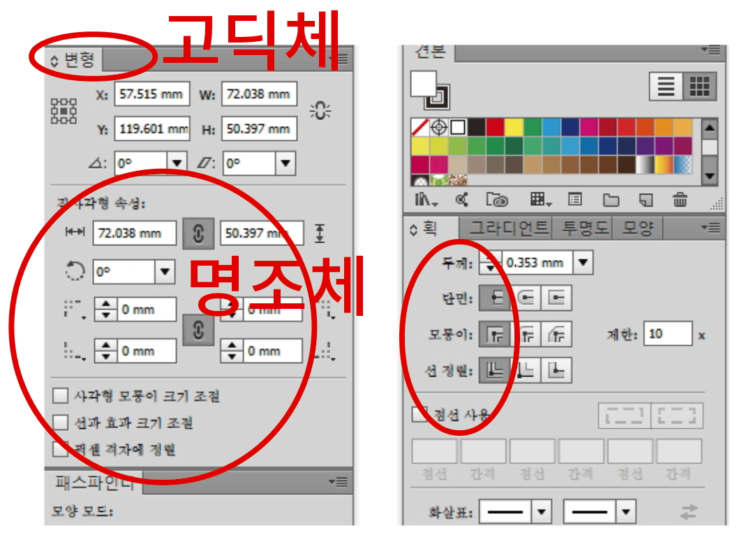 그림과 같이 일러스트 프로그램을 열면 도구툴바 제목은 고딕으로 나오는데,