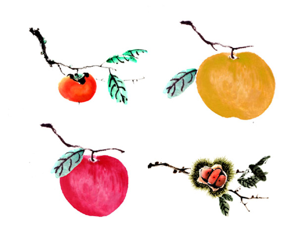 먹그림 - 과일4종(감,알밤,배,사과)