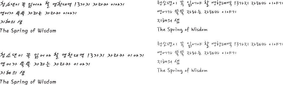 세종소주체, 봄날체로 좀 부탁드려용~~ Voyager 일반 0 3745 2009.01.19 19:00 -0001.11.30 00:00 vo.ai (0byte) + 31 > > 청소년이 꼭 읽어야 할 영한대역 13가지 자타카 이야기 > 영어가 쑥쑥 자라는 자타카 이야기 > 지혜의 샘 > The Spring of Wisdom > > 부탁드려용~~ >