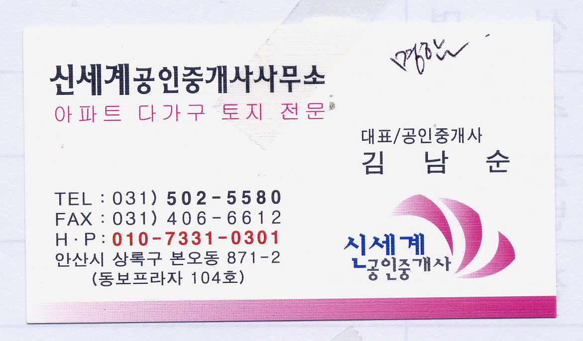 급히 글씨 부탁드립니다~ 조희진 일반 0 3798 2009.05.16 11:43 오늘 들어가야 하는 건데 글씨체가 없어서요~ 똑같이 해달라고 하셨는데~ 상호명하고 하단 상호명 부탁드립니다. 신세계공인중개사사무소 신세계공인중개사