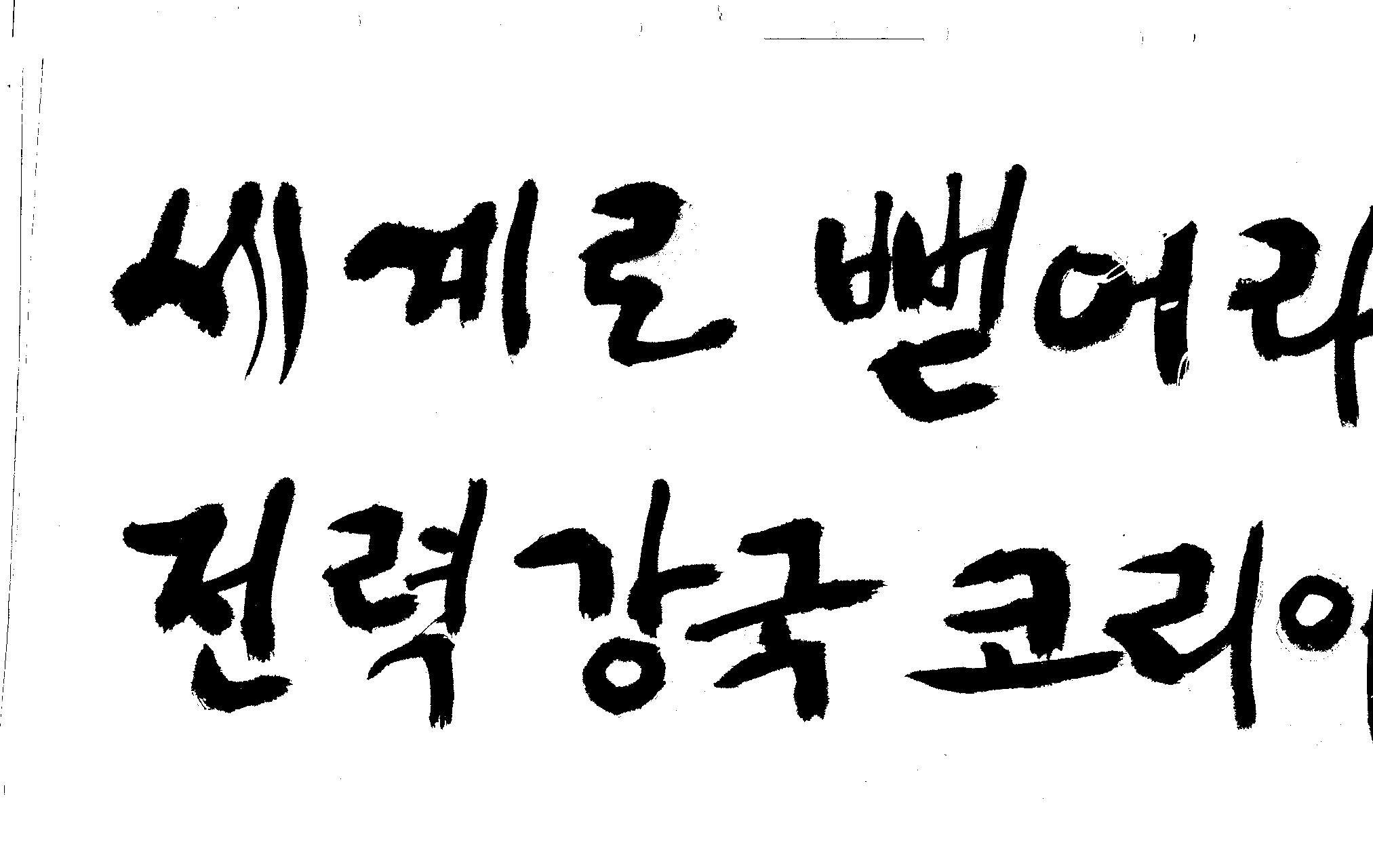 캘리 좀 부탁드려요!~ 김철호 일반 1 12559 2008.12.24 12:09 > > > > > > > > > 전력회사 신문광고를 하는데요 캘리로 멋지게 하고픈데 > > > 캘리프로그램으로 아무리 써도 느낌이 안나옵니다 ㅜ.ㅜ > > > 이런걸 부탁한다는 자체가 너무나도 염치없지만 부탁드립니다. > > > > > > 세계로 뻗어라! 전력강국 코리아 > > > > > 보기는 쉬워도 하기는 어려운게 > > 세상 모든 일 일겁니다. > > 그중에 캘리그라피가 그런 것일 겁니다... > > 스캔중에 글꼴이 잘린것은 서로다른글꼴서 편집하시길... > > 글수가 많아서 어쩔 수없네요... > > >